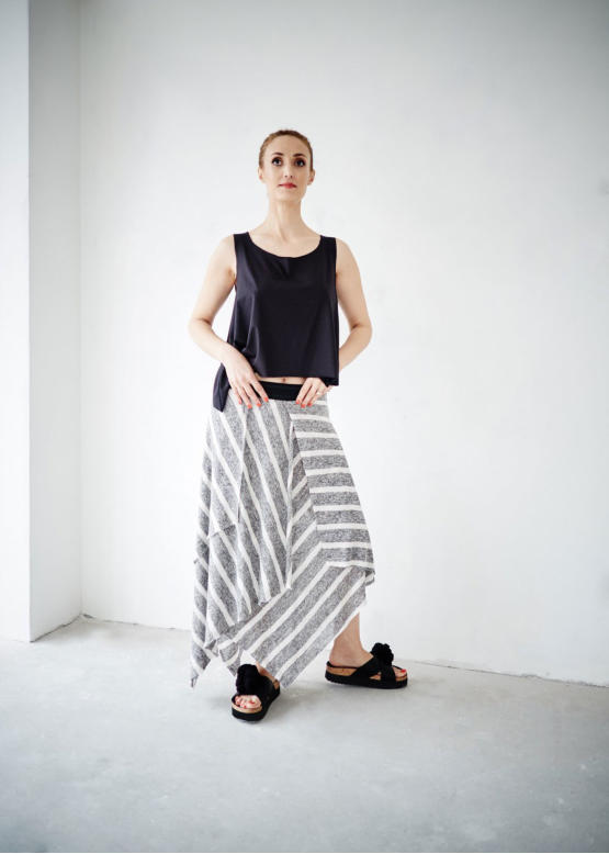 Fusta in dungi gri cu alb, asimetrica, elastic negru in talie.